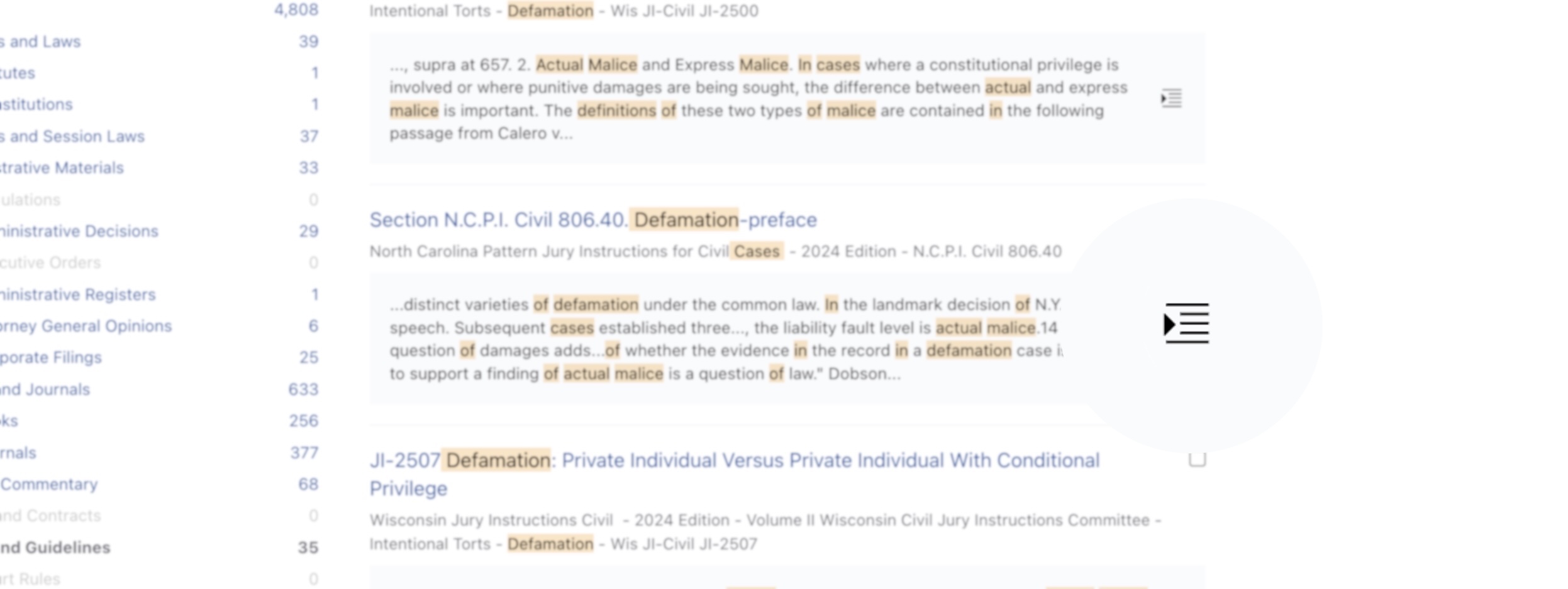 • Left column: Provides options to refine your search results by content, jurisdiction, and date range, or to search within the results.